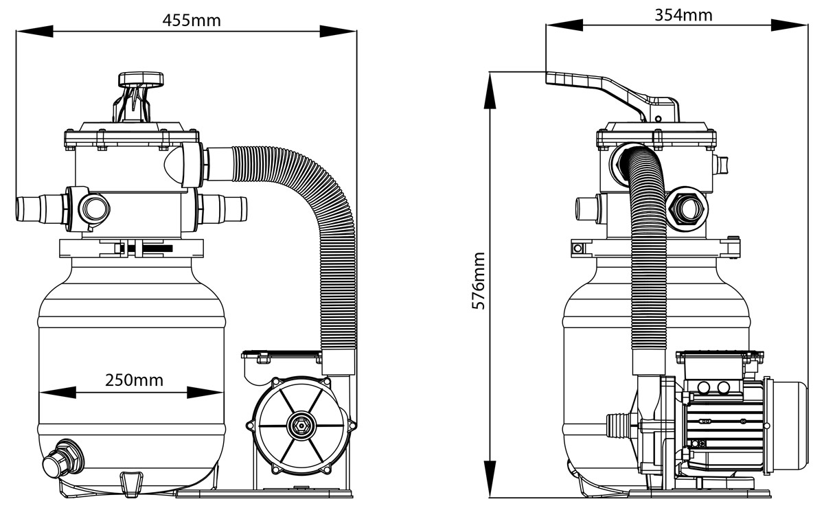 Le groupe de filtration est composé d’une pompe de 200 W et d’un filtre à sable équipé d’une vanne multivoies 7 positions. Cette configuration permet le filtrage, le lavage, le rinçage et la vidange du filtre. La cuve de 25 cm de diamètre accueille jusqu’à 12 kg de sable. Sa structure résiste aux UV et supporte une température d’exposition maximale de 40 °C.